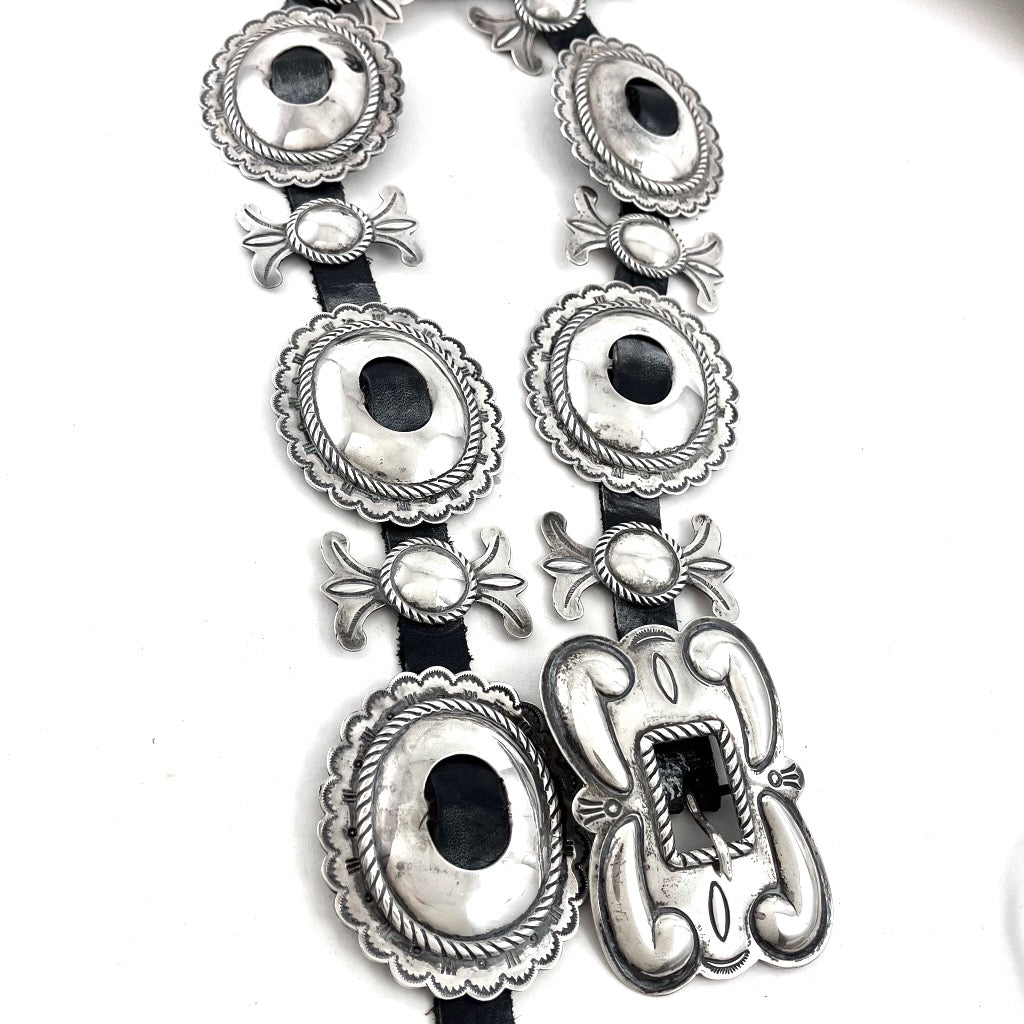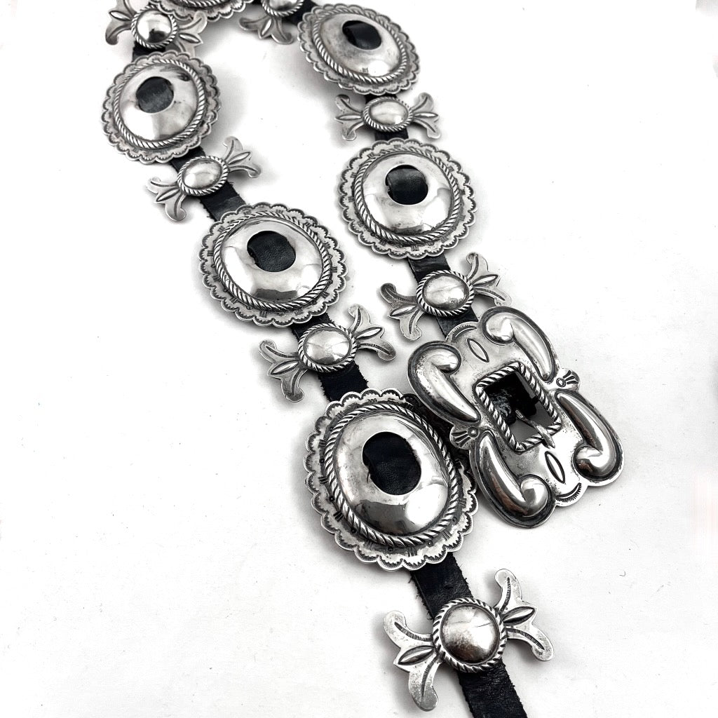 Vintage sterling silver concho belt, circa 1970's by Navajo artist Marie Silver. Signed M SILVER.