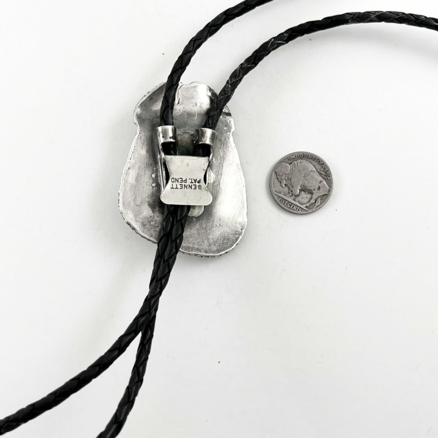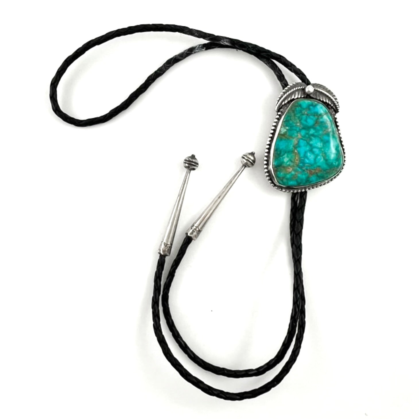 Sterling silver with a beautiful American turquoise stone with handmade leave and drop beads. Unsigned. There is the name 'Eddie' etched on the back by a previous owner.