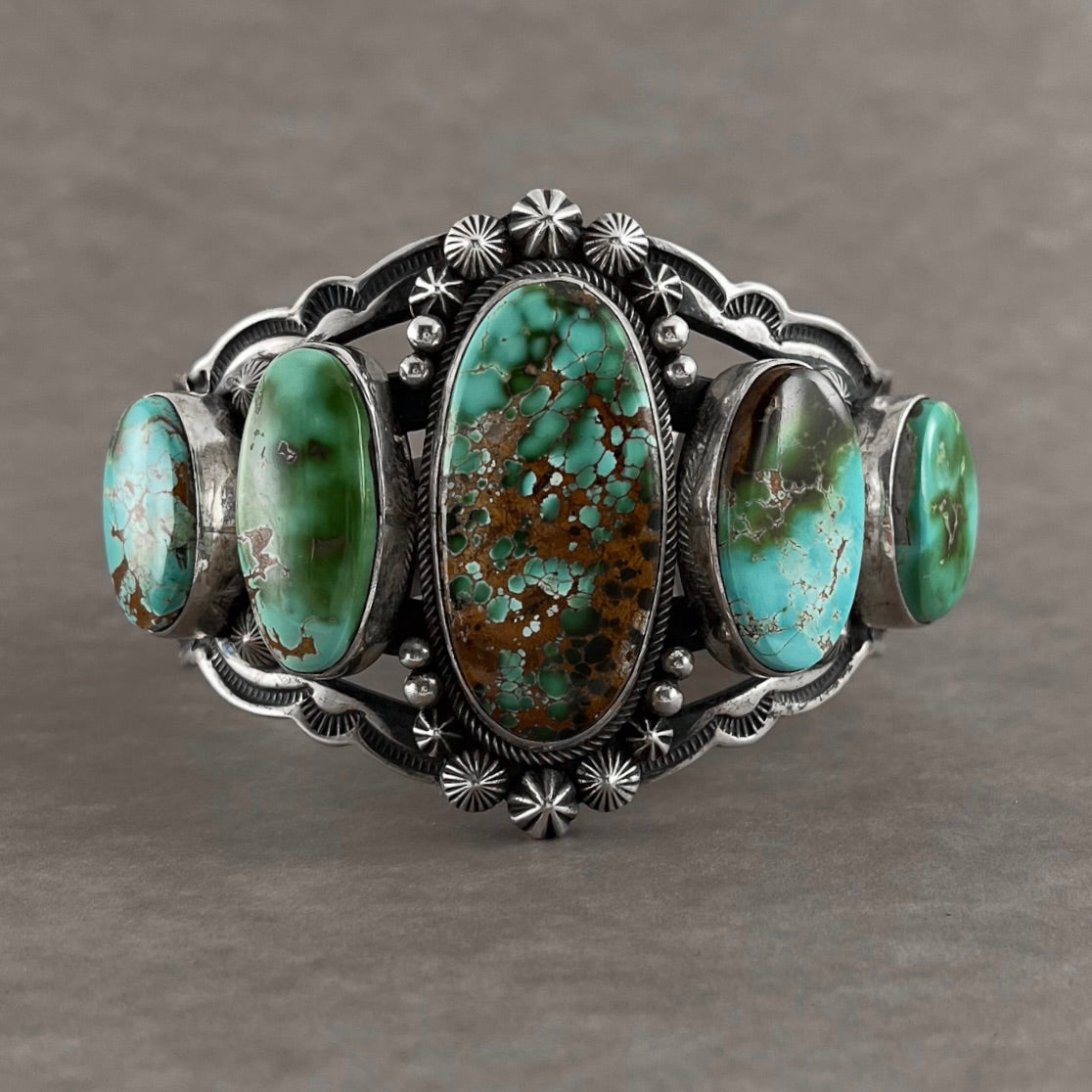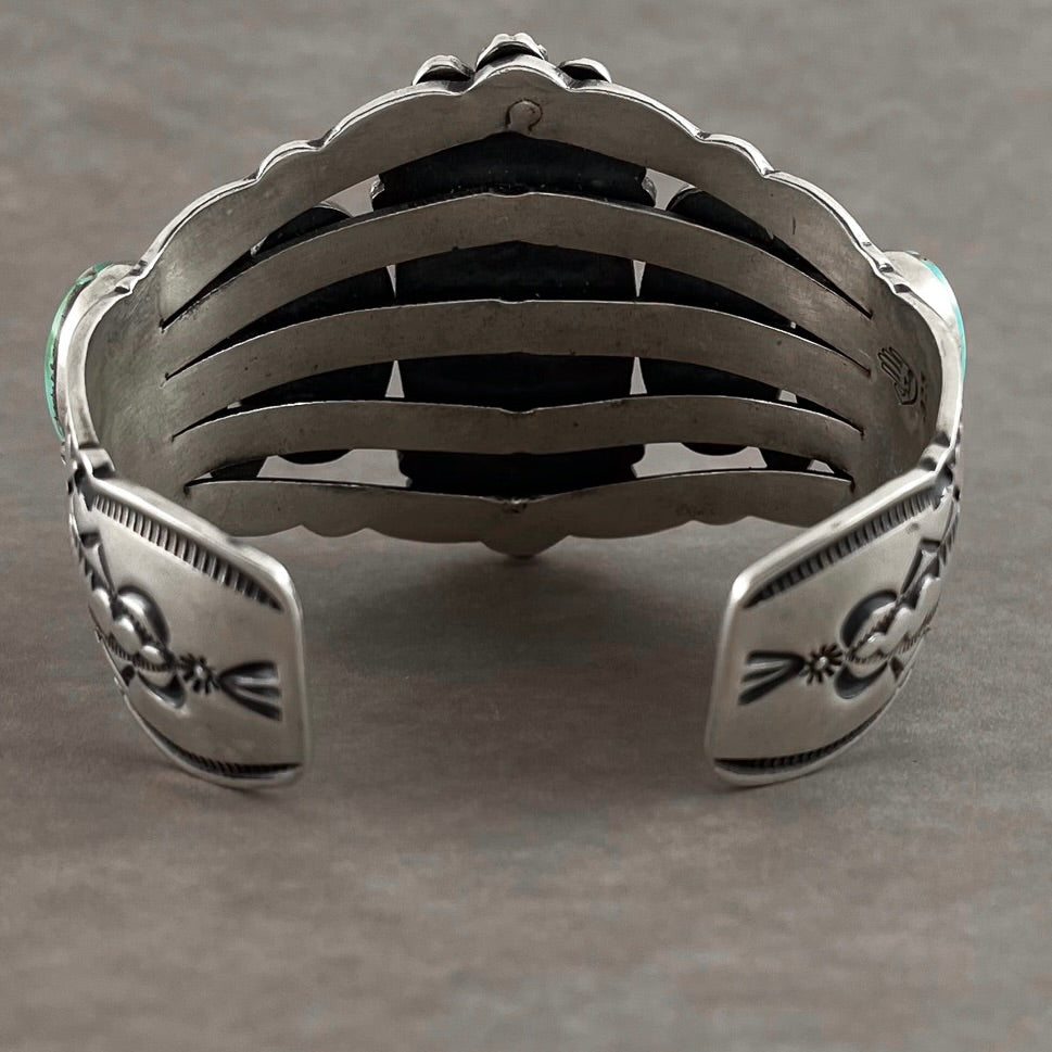 Gorgeous Royston turquoise stones set in plain silver with traditional stamp work by Navajo artist Aaron Toadlena. Signed by the artist and marked sterling.