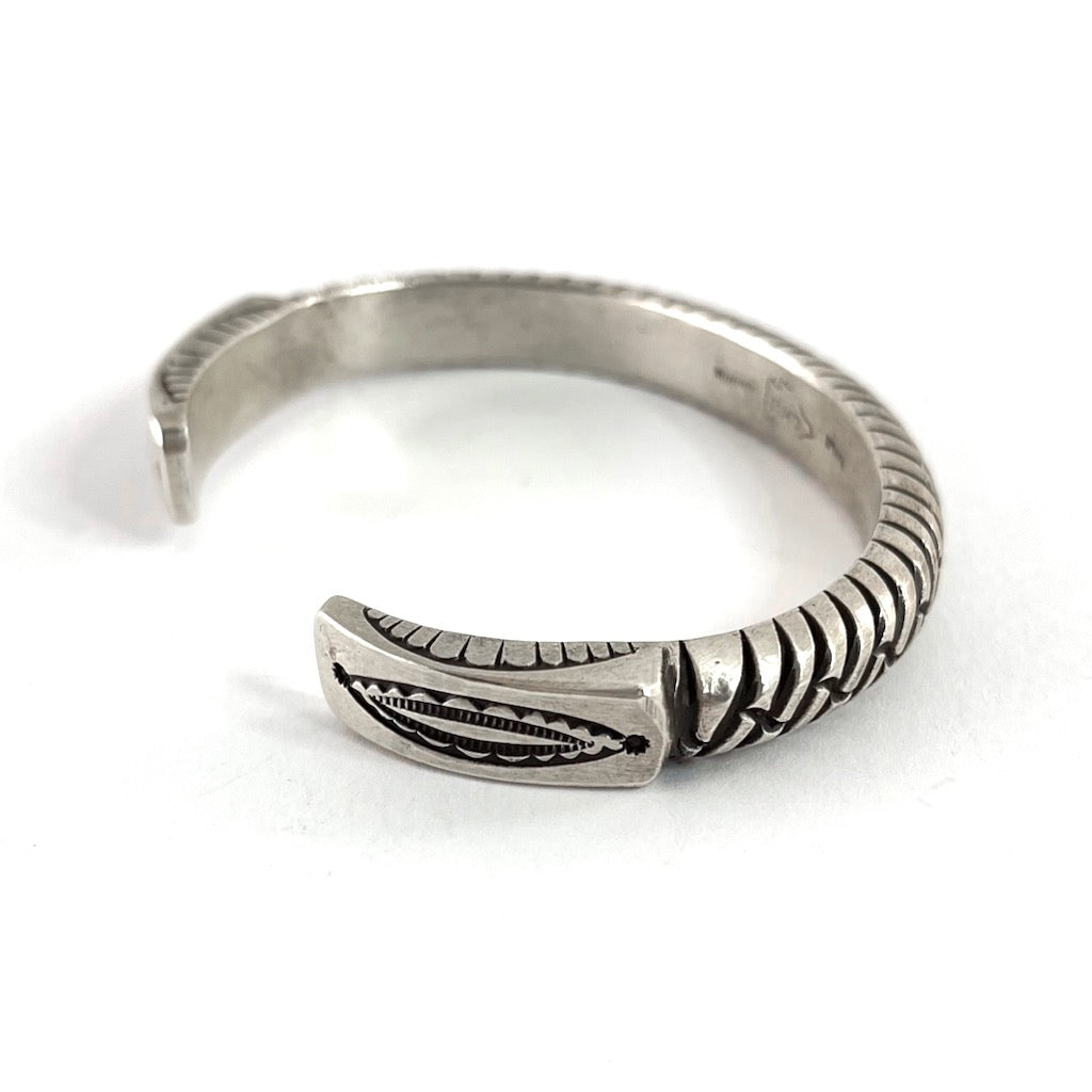 Outstanding cast and file work by Navajo artist Calvin Martinez. Strong enough to wear alone or hold its own in a larger stack, adding texture and depth. Signed by the artist and marked sterling.