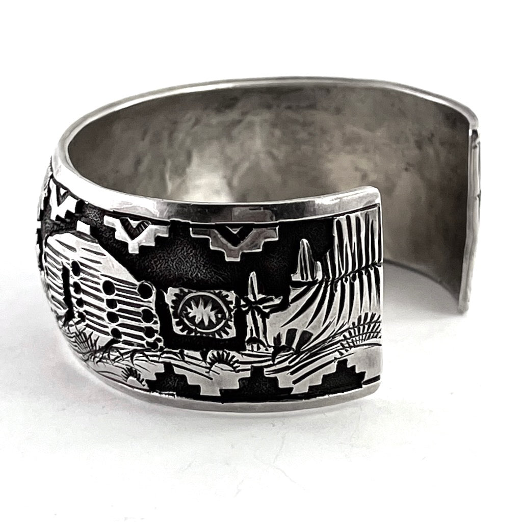 Sterling silver overlay storyteller bracelet by Navajo artists G & J Runnels. The scenes depict life on the reservation in the Great Southwest with sheep herding, weaving and the memorable rock formations. Signed by the artists and marked sterling.
