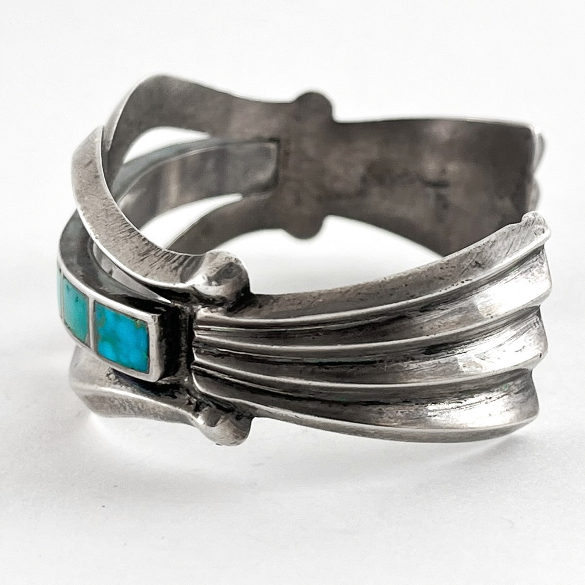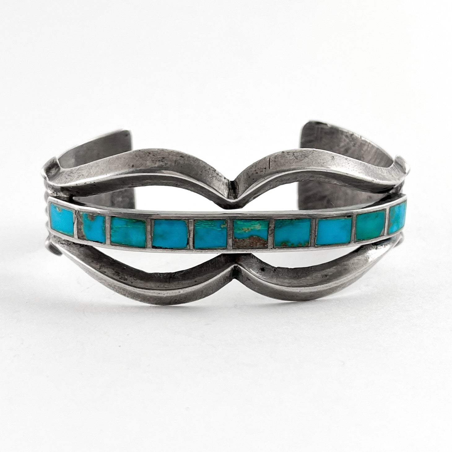 Vintage sterling silver cast bracelet with Blue Gem turquoise inlaid in a solid band across the front of the bracelet. Circa 1960's-70's. Zuni.