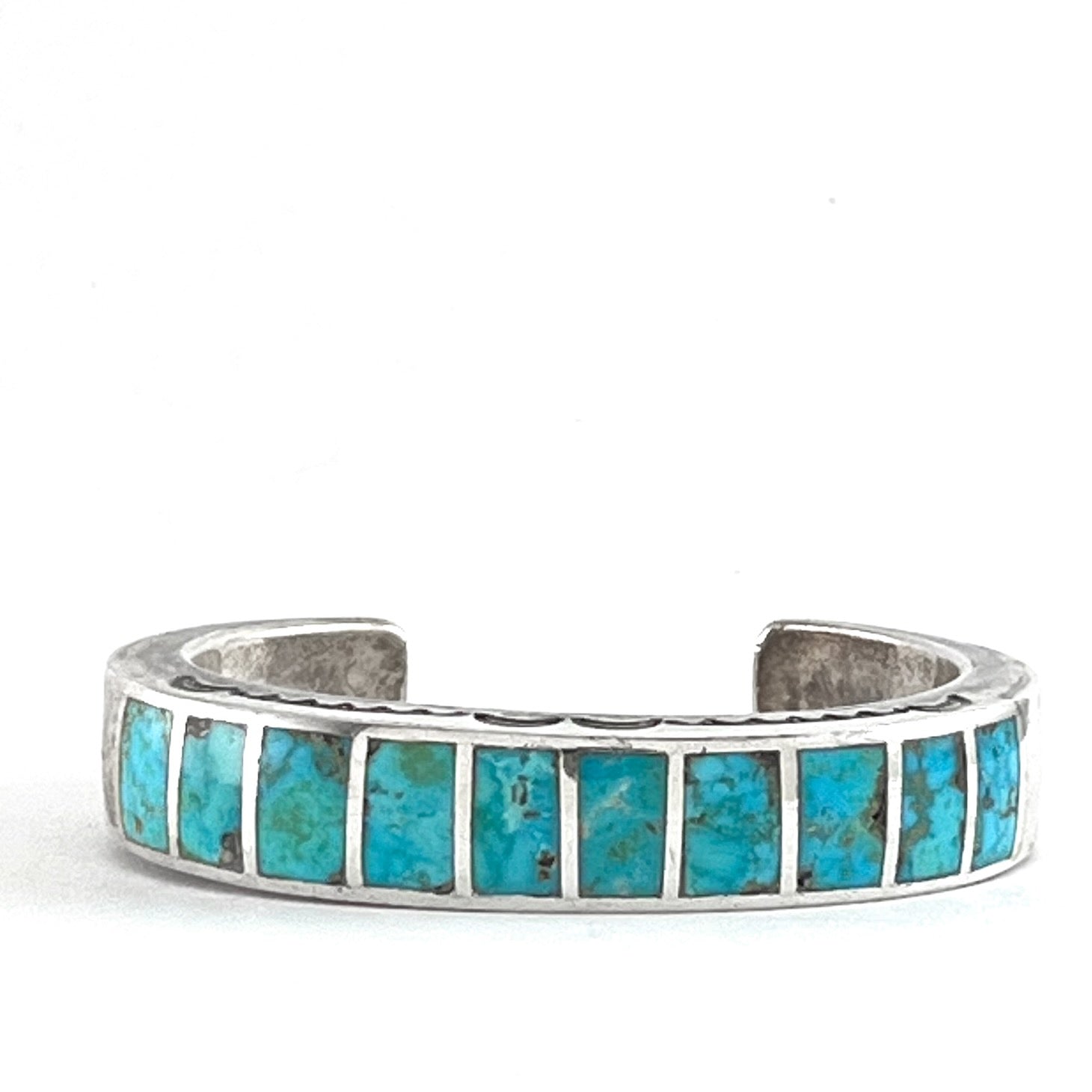 Vintage inlay bracelet, circa 1960's with ten square cut American turquoise stones and interesting stamp work on the solid shank of the bracelet. Unsigned. Zuni. We've left the vintage patina but it could be shined to a 'like  new' shine!