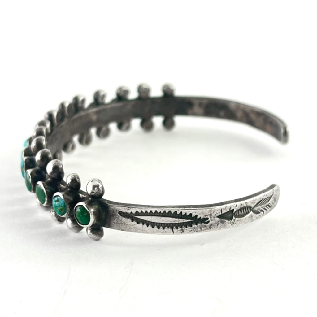 Vintage sterling silver bracelet with single row of round cut stones, circa 1940's. Unsigned. Cool arrow stamps and heavy applied silver drop beads frame the stones and add a little protection. Great worn alone or in a stack!!