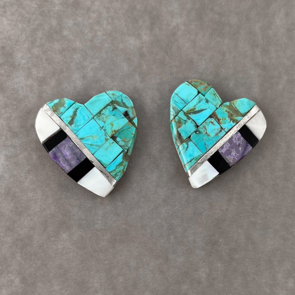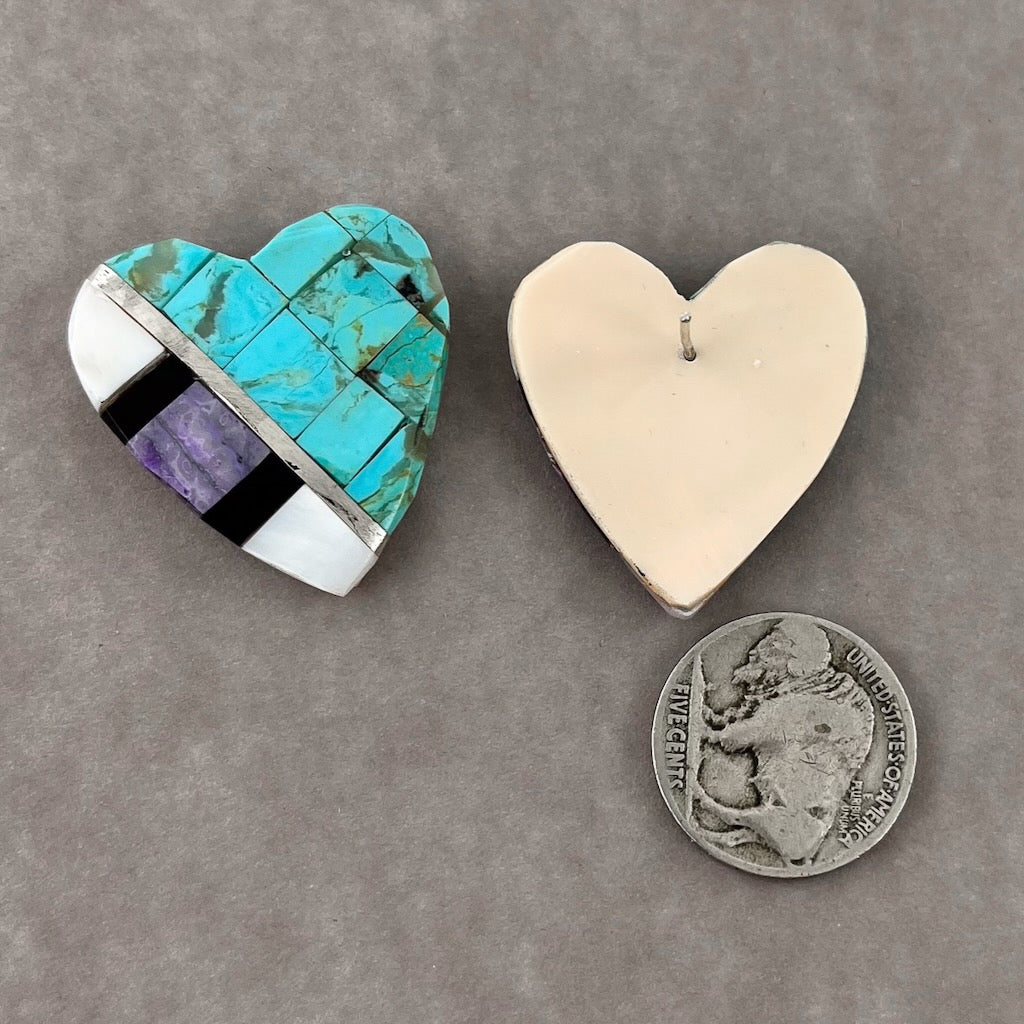 Turquoise, jet, charoite, mother of pearl and sterling silver inlaid in a mosaic on a shell base by Kewa artist Phyllis Rosetta.