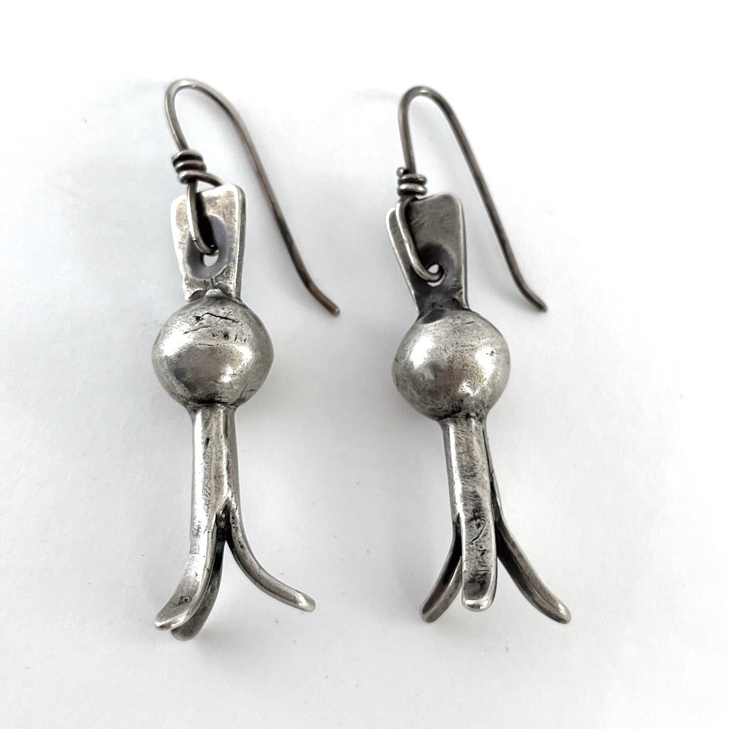 Vintage ingot silver blossom earrings with handmade sterling silver wires. Maker unknown. These are earthy and you can feel the maker's hand in the surface of the silver. Circa 1940's