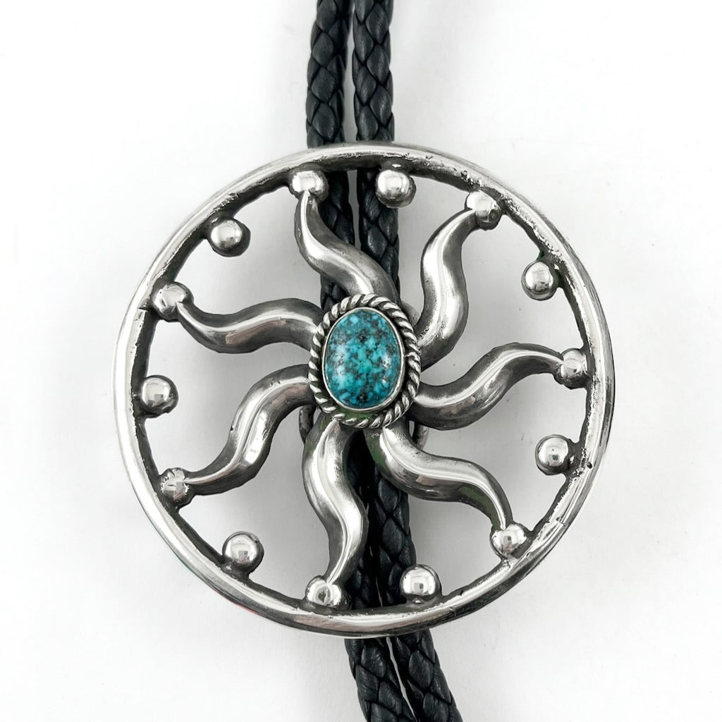 Large vintage sterling silver bolo tie with American turquoise and handmade hardware. Circa 1970's. Unsigned.