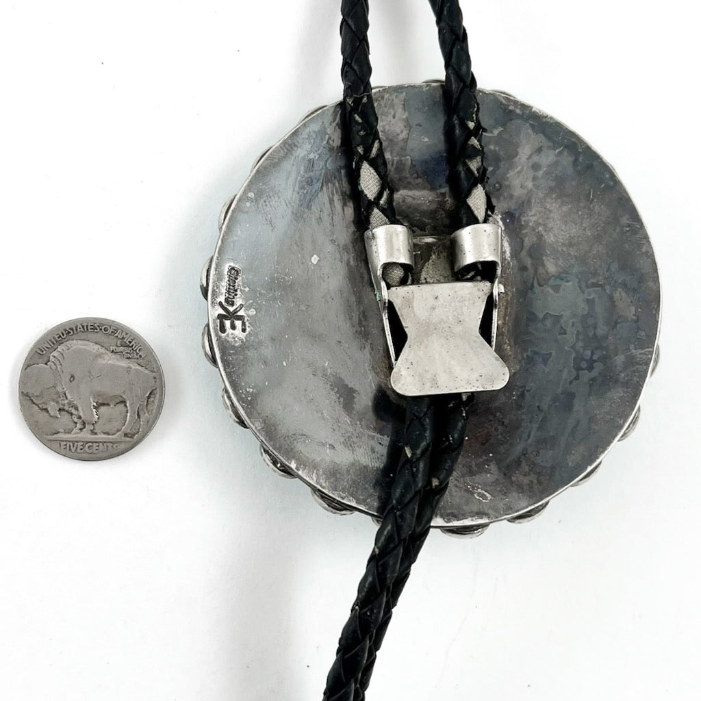 Sterling silver with Sleeping Beauty turquoise bolo tie by Navajo artist Emerson Kinzel. Signed by the artist and marked sterling.