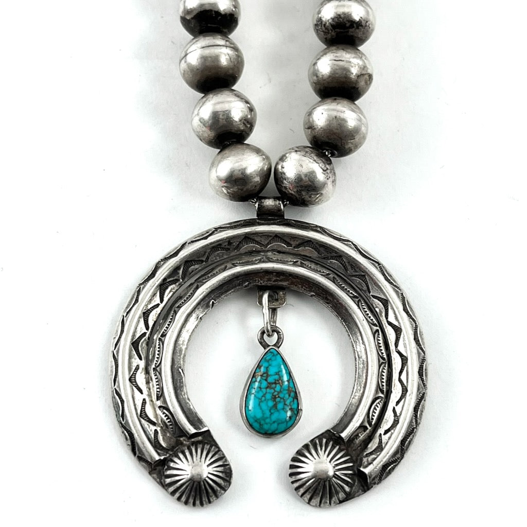 Beautiful vintage naja with natural American turquoise stone and hand stamp work on handmade ingot silver beads. Circa 1920's-30's. Unsigned. Navajo.