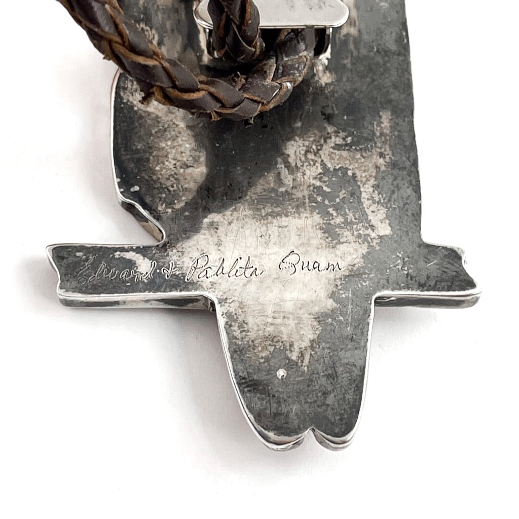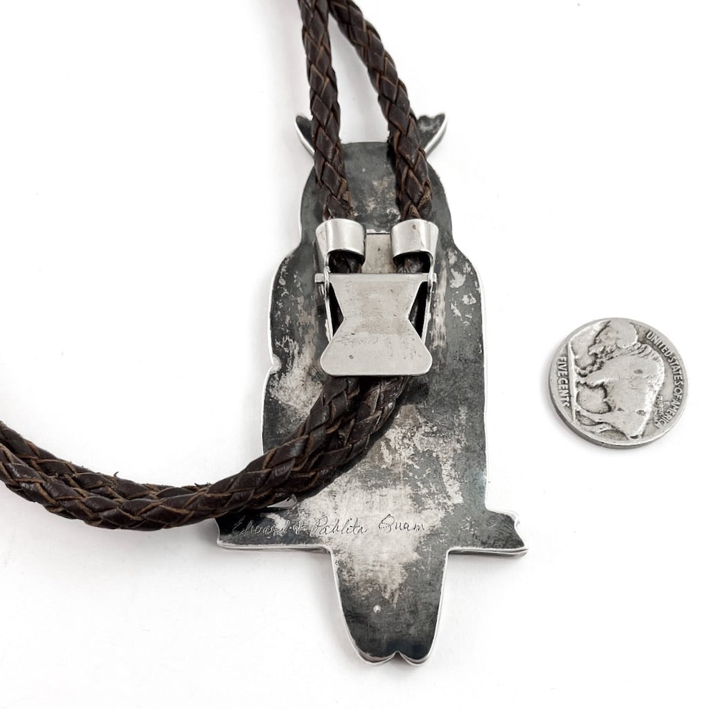 Vintage inlaid bolo tie in sterling silver with shell by Zuni artists Edward and Pablita Quam (b1939). Signed by the artists.