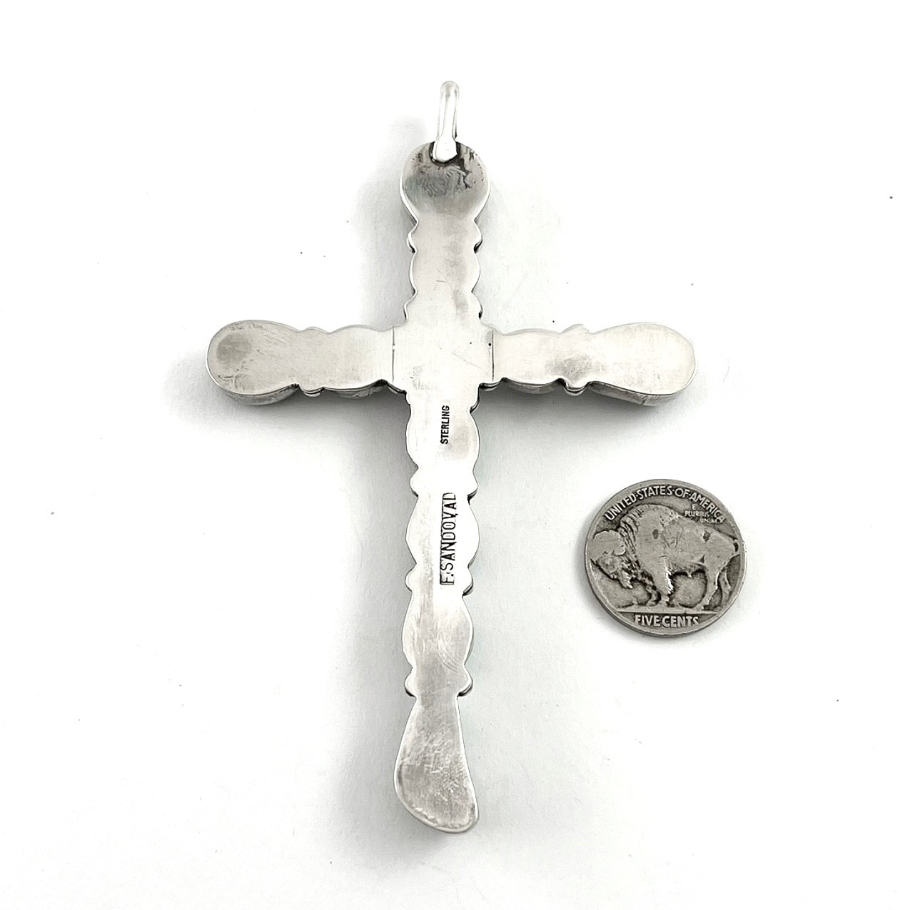 Large sterling silver cross with eleven American turquoise stones set in plain silver bezels. Signed F. Sandoval and marked sterling. Navajo.