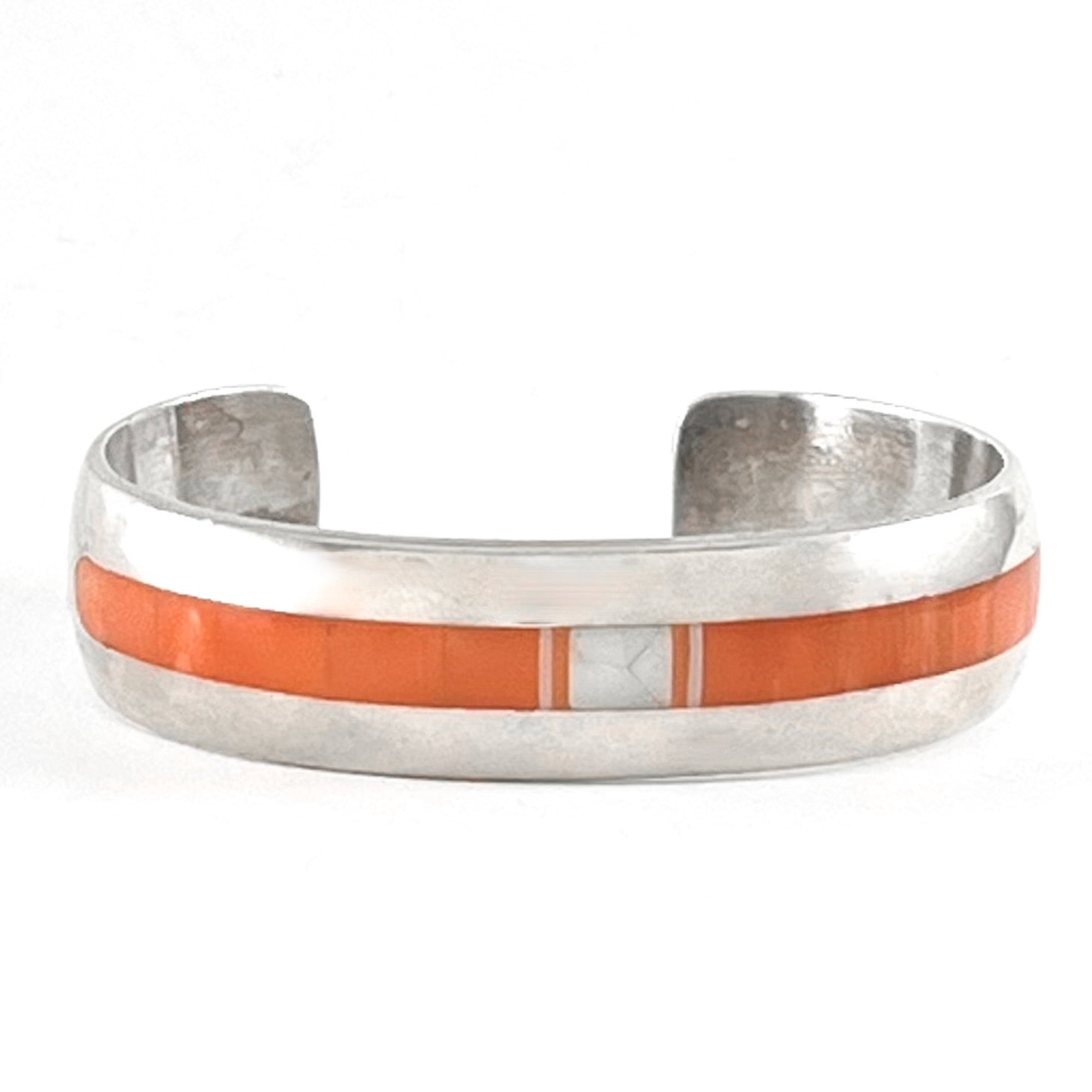 Smooth and versatile. Sterling silver inlaid with mother of pearl and Mediterranean coral by Veronica Benally. Navajo. Signed by the artist and marked sterling. Think white jeans and a t-shirt! Fresh as a summer day. Note: this bracelet is shaped for a rounder wrist.
