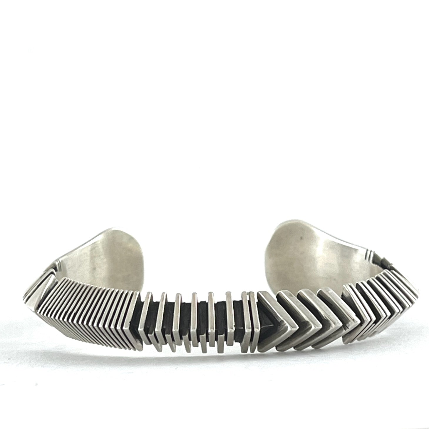 Sterling silver bracelet is created by hand cutting and stacking heavy silver to create a rugged formation.