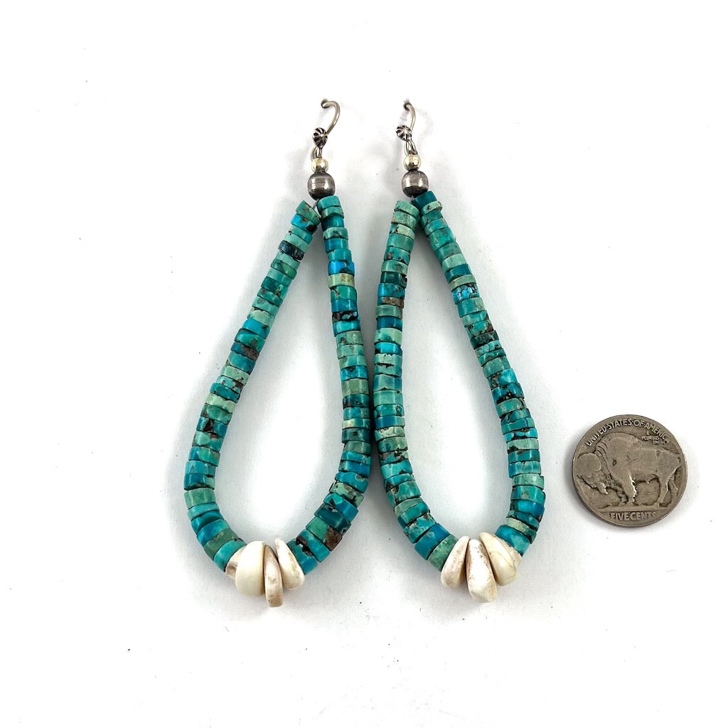 Vintage hand cut American turquoise earrings with white shell 'corns' as traditional accent colors. These have been modified with long sterling silver French wires and each jacla earring is topped with a sterling accent bead.