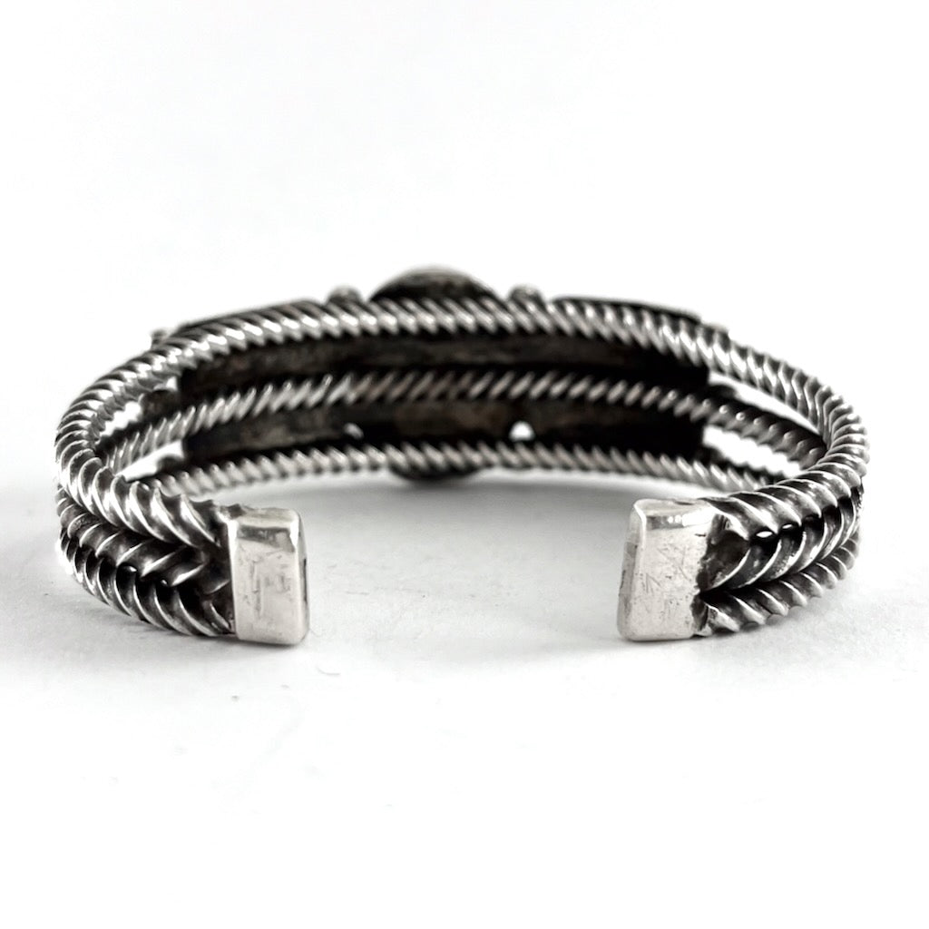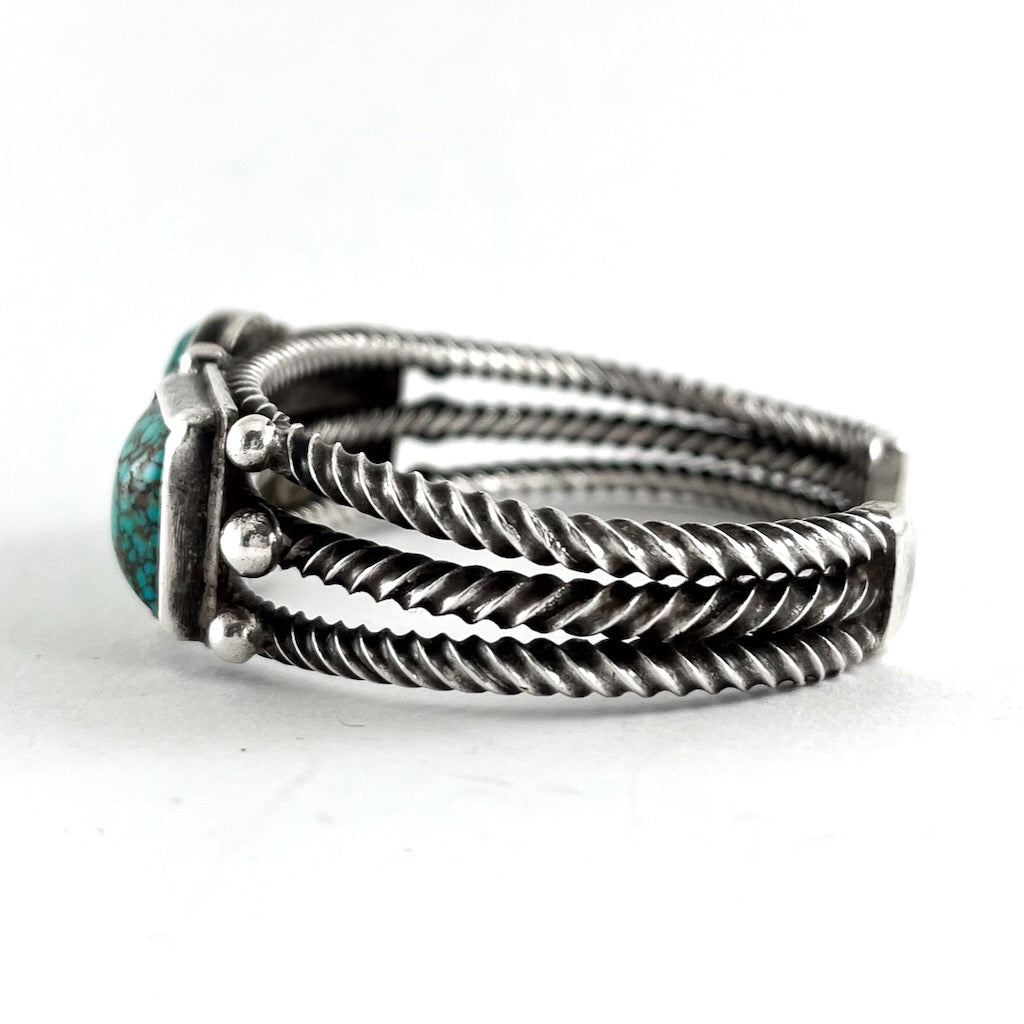 Vintage mid century sterling silver bracelet with three American turquoise stones set in plain silver bezels and mounted on hand drawn sterling twist wire. Capped end terminals add strength and a polished finished look. Unsigned. Circa 1940's-50's.