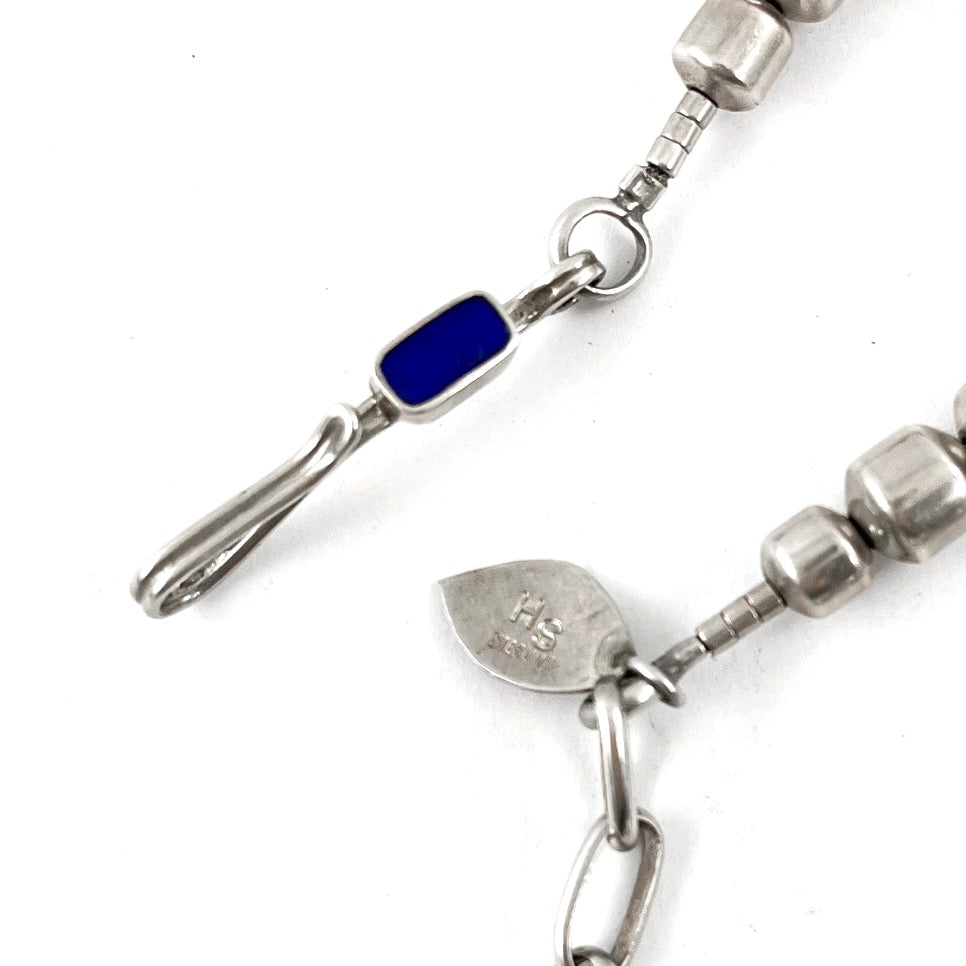A beautiful necklace in sterling silver with inlaid lapis and handmade clasp with lapis by Navajo artist Sherri Hale. Small signature tag with SH and sterling. Handmade clasp and 2" extender chain also.