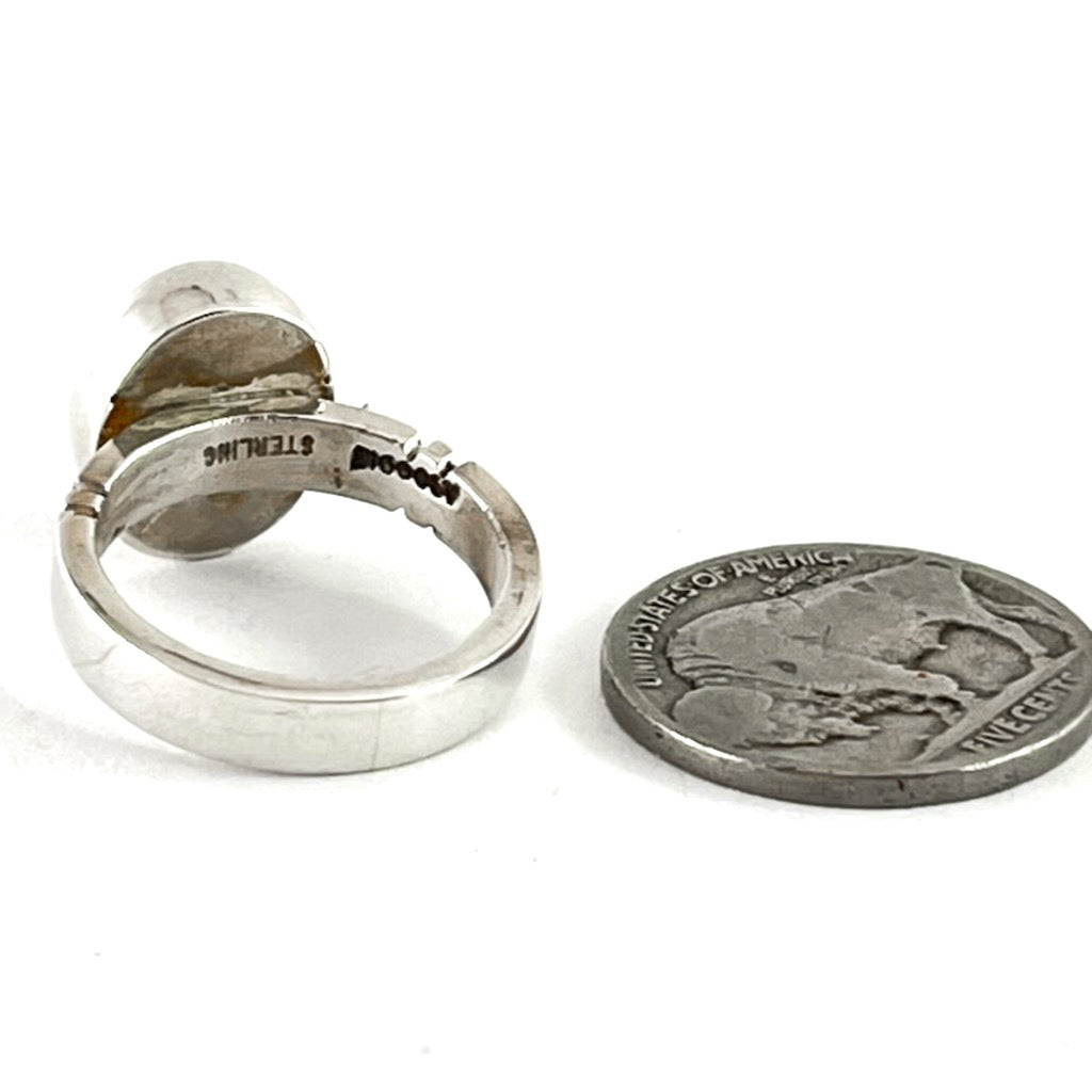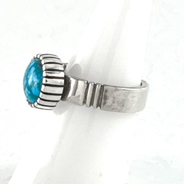 Gorgeous natural Kingman turquoise set in a heavy handmade bezel by Navajo artist Craig Agoodie. Signed by the artist and marked sterling.